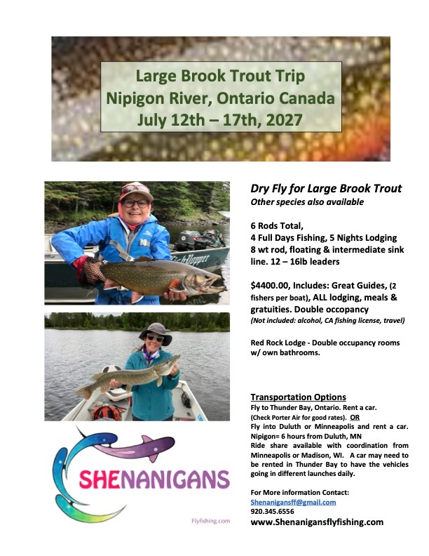 All Inclusive - 6 people total, 4 Days Fishing, 5 Nights lodging. Fishing for Monster Brook Trout, Coasters, Possible Salmon, Steelhead & Pike. Both Streamer and Dry Fly Fishing. Everyone does both types of fishing.